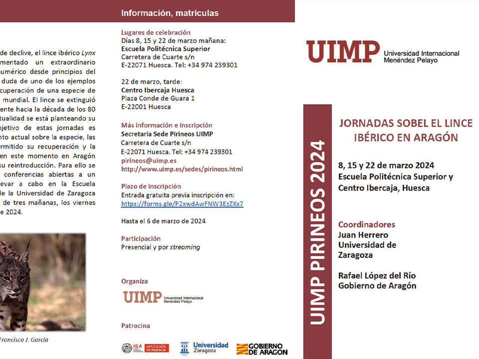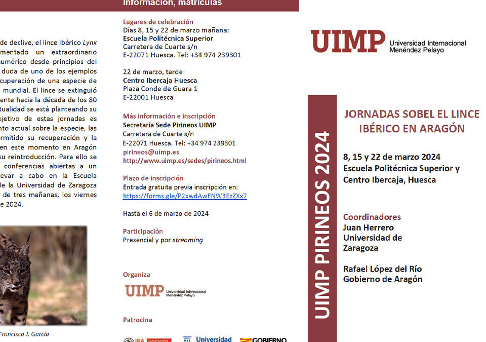 marzo 5, 20245 de marzo de 2024. La Escuela Politécnica Superior (Carretera de Cuarte s/n E-22071 Huesca) y el Centro Ibercaja Huesca (plaza Conde de Guara) acogerán, los próximos días 8, 15 y 22 de marzo, unas jornadas sobre el lince ibérico en la Comunidad Autónoma de Aragón.