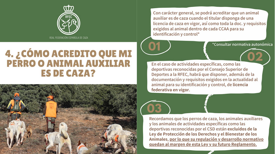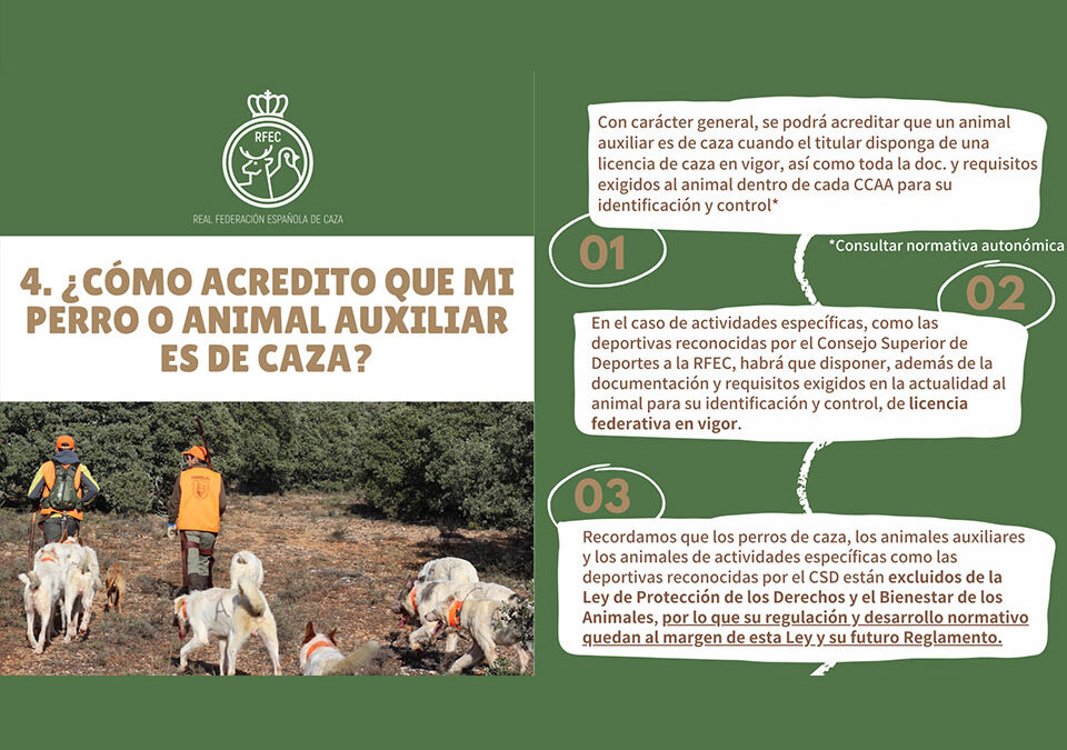 Con carácter general, se podrá acreditar que un animal auxiliar (perros, hurones, aves de cetrería, perdices de reclamo, palomas de cimbel) es de caza cuando el titular disponga de una licencia de caza en vigor, así como toda la documentación y requisitos exigidos al animal dentro de cada comunidad autónoma para su identificación y control.
