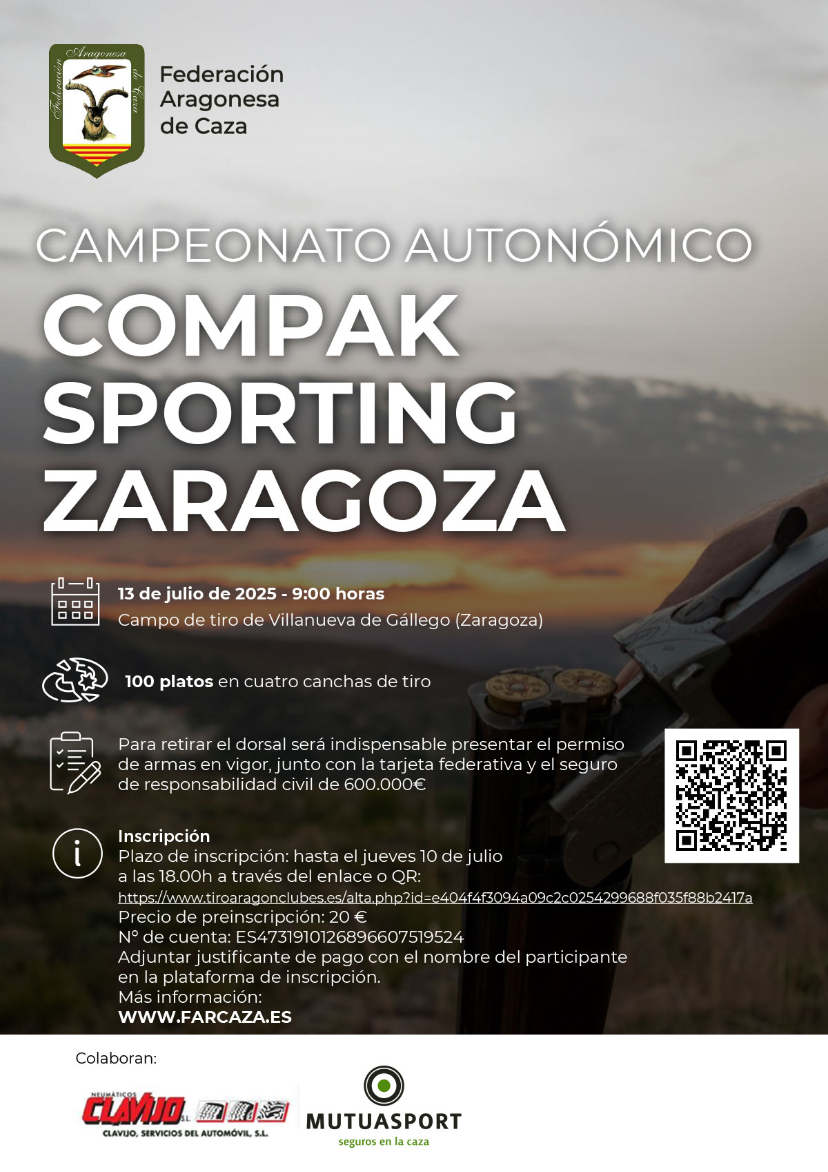 Plazo de inscripción: hasta el jueves 10 de julio a las 18.00h a través del enlace o QR: https://www.tiroaragonclubes.es/alta.php?id=e404f4f3094a09c2c0254299688f035f88b2417a Precio de preinscripción: 20 € Nº de cuenta: ES4731910126896607519524 Adjuntar justificante de pago con el nombre del participante en la plataforma de inscripción.