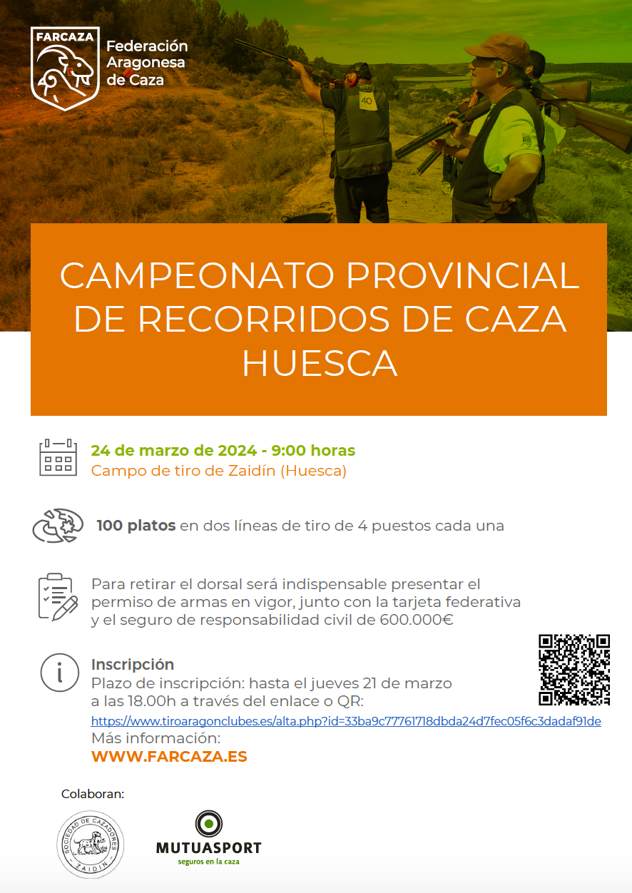 marzo 3, 20241 de marzo de 2024. El campo de tiro de Zaidín (Huesca) acogerá el próximo 24 de marzo el Campeonato Provincial de Recorridos de Caza (RRCC) de Huesca. La prueba comenzará a las 9.00 horas y se disputará a 100 platos en dos líneas de tiro de 4 puestos cada una.