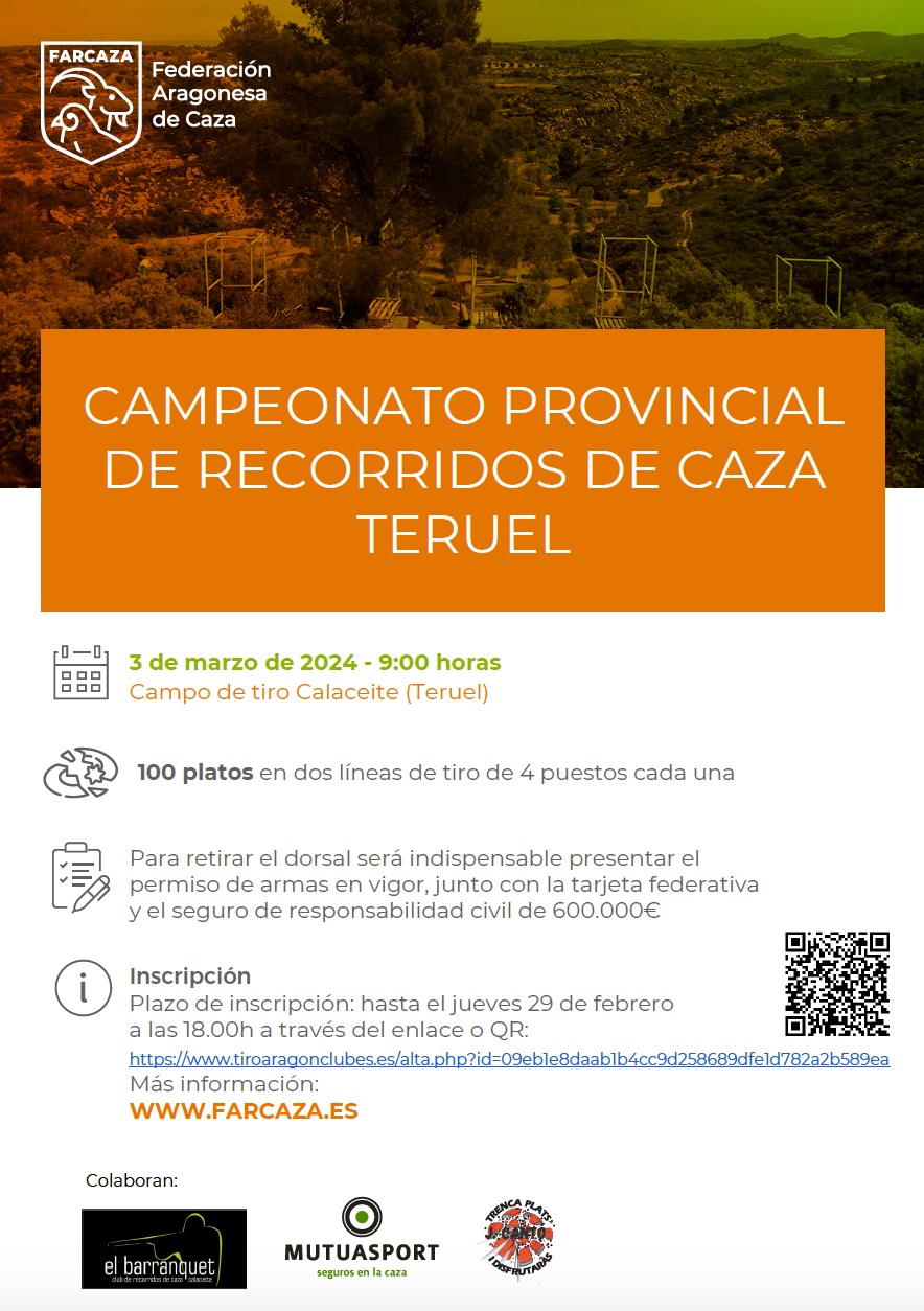 La Federación Aragonesa de Caza (FARCAZA) recuerda que para retirar el dorsal será indispensable que los participantes presenten el permiso de armas en vigor, además de la tarjeta federativa y el seguro de responsabilidad civil con una cobertura de al menos 600.000 euros.