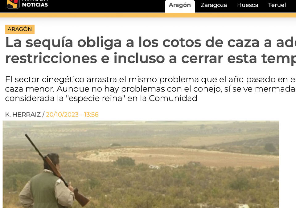 octubre 23, 202322 de octubre de 2023. Las restricciones que están aplicando algunos cotos de caza por la sequía y las altas temperaturas en el inicio de la temporada de caza menor han sido objeto de noticia en la web Aragón Noticias, el portal informativo de la Corporación Aragonesa de Radio y Televisión (CARTV).