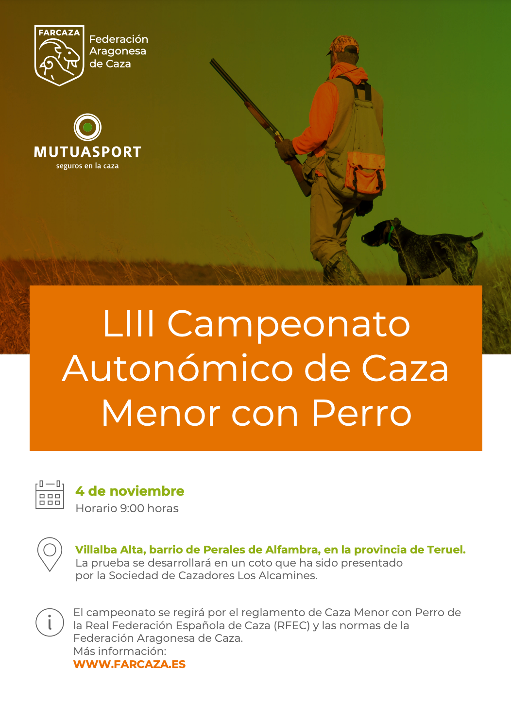 noviembre 3, 202330 de octubre de 2023. El LIII Campeonato Autonómico de Caza Menor con Perro de Aragón ya tiene fecha. La competición organizada por la Federación Aragonesa de Caza (FARCAZA) se disputará el próximo 4 de noviembre, sábado, en Villalba Alta, barrio de Perales de Alfambra, en la provincia de Teruel.