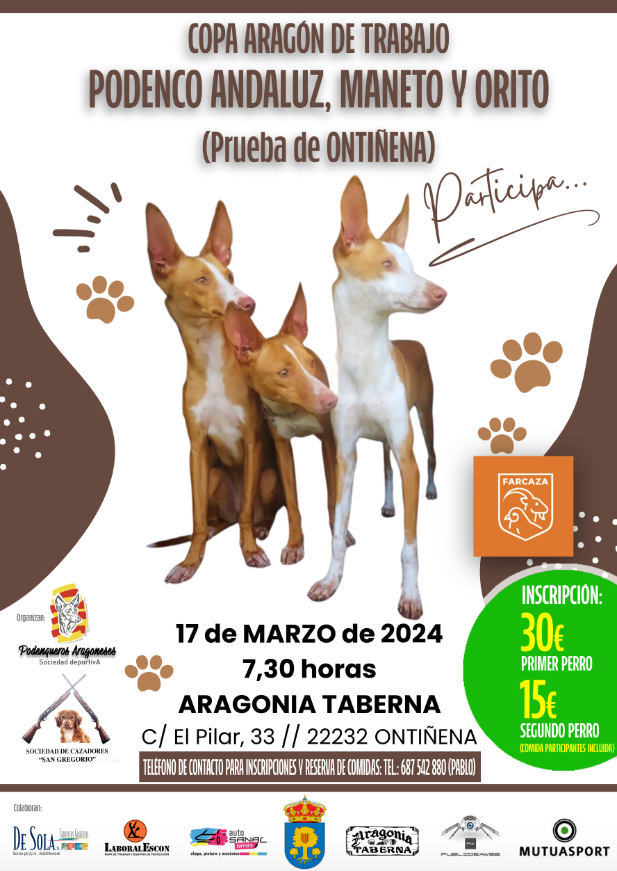 febrero 13, 202411 de febrero de 2024. La sociedad deportiva Podenqueros Aragoneses y la Sociedad de Federada de Caza San Gregorio de Ontiñena (Huesca) han organizado la primera Copa Aragón de Trabajo para podenco andaluz, maneto y orito.