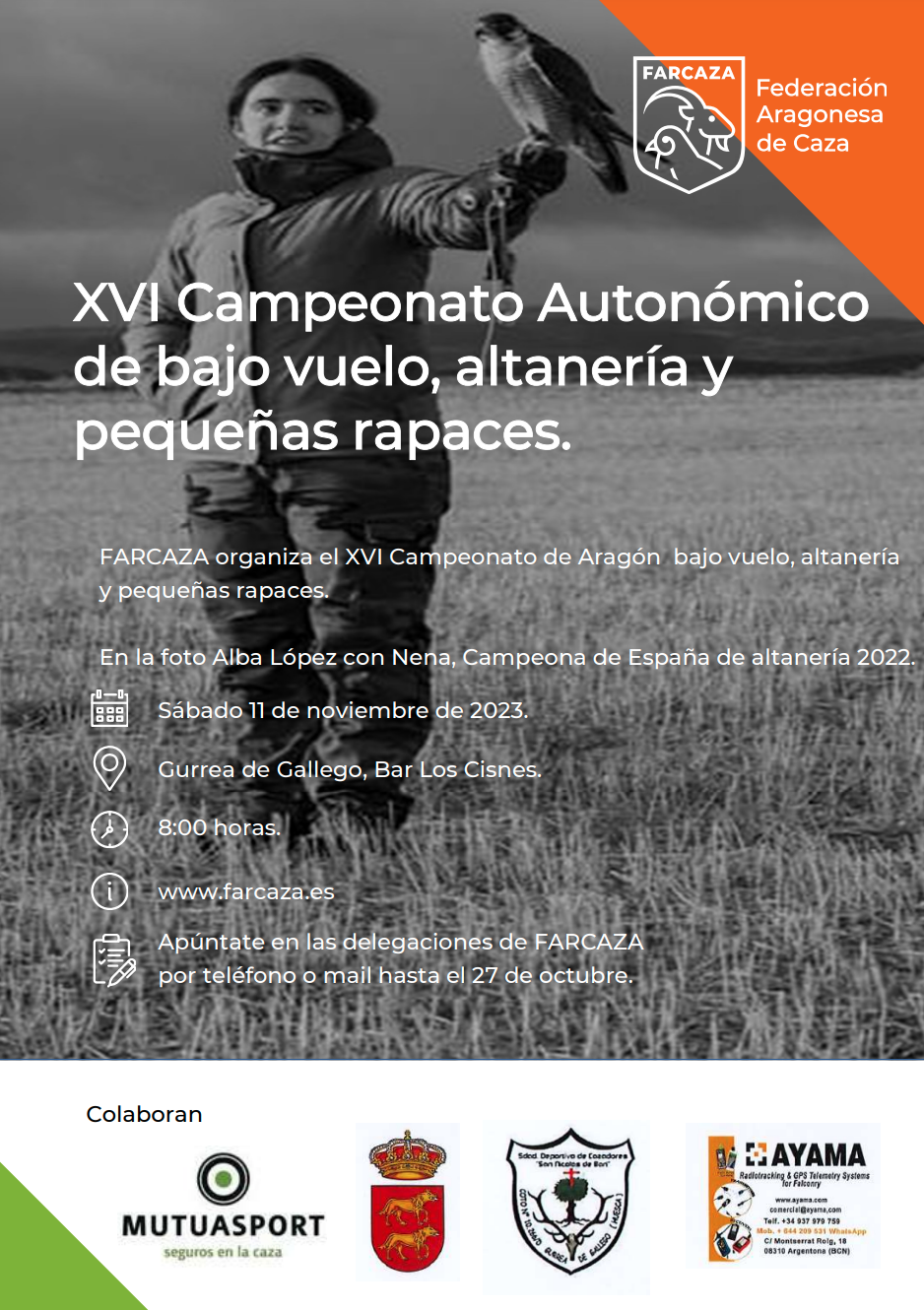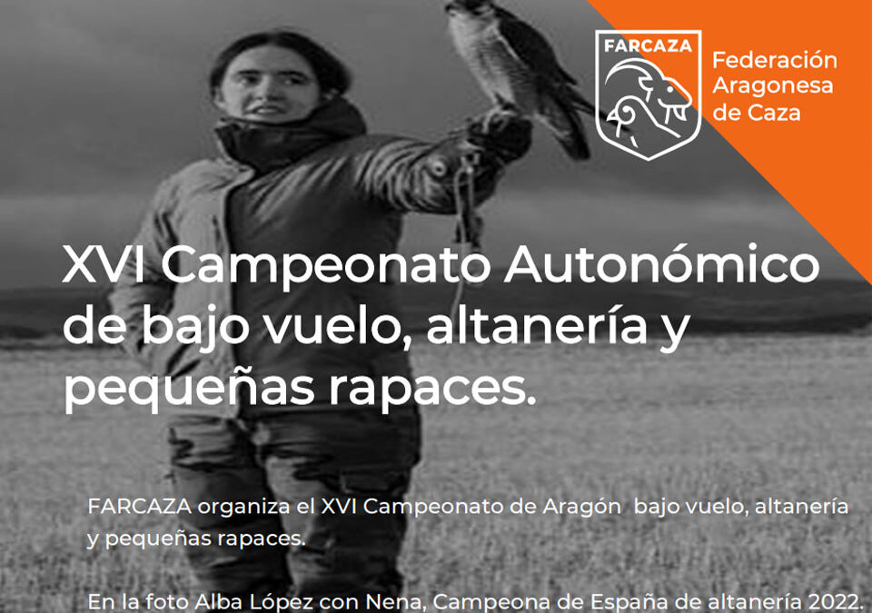 12 de octubre de 2023. El XVI Campeonato Autonómico de bajo vuelo, altanería y pequeñas rapaces organizado por la Federación Aragonesa de Caza (FARCAZA) ya tiene fecha: se celebrará el próximo 11 de noviembre en la localidad oscense de Gurrea de Gállego.